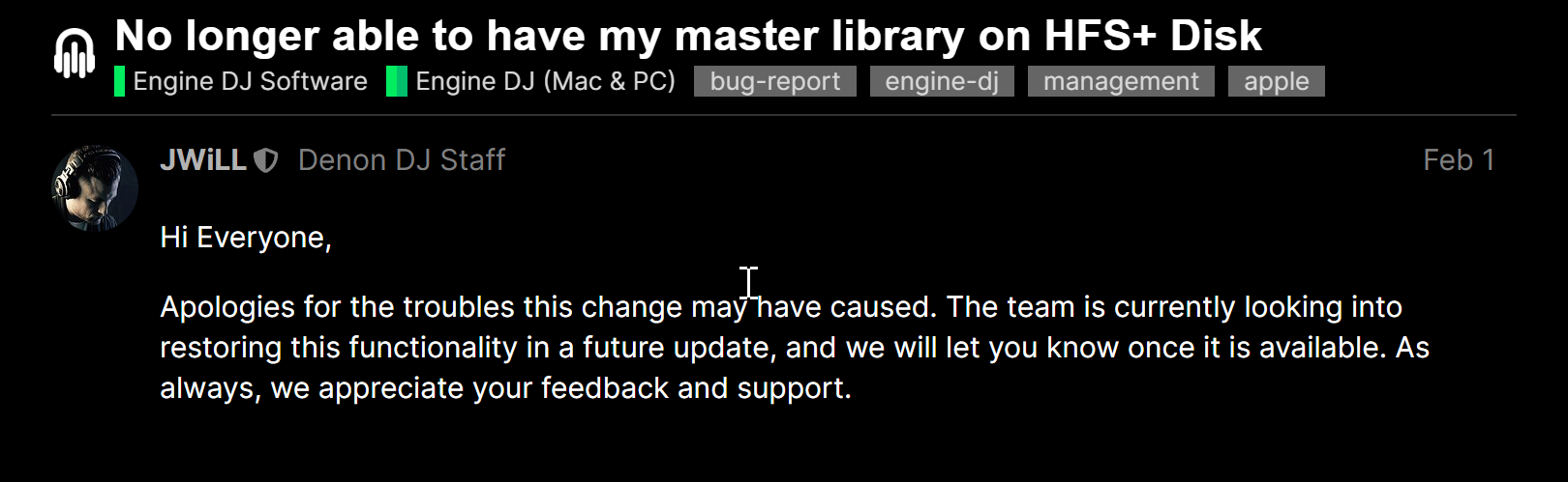 Luckily my external storage is proper Thunderbolt 2, my external is still APFS and still works with Engine DJ. Guess I should hope and pray the thunderbolt enclosure or the drive within it never dies…