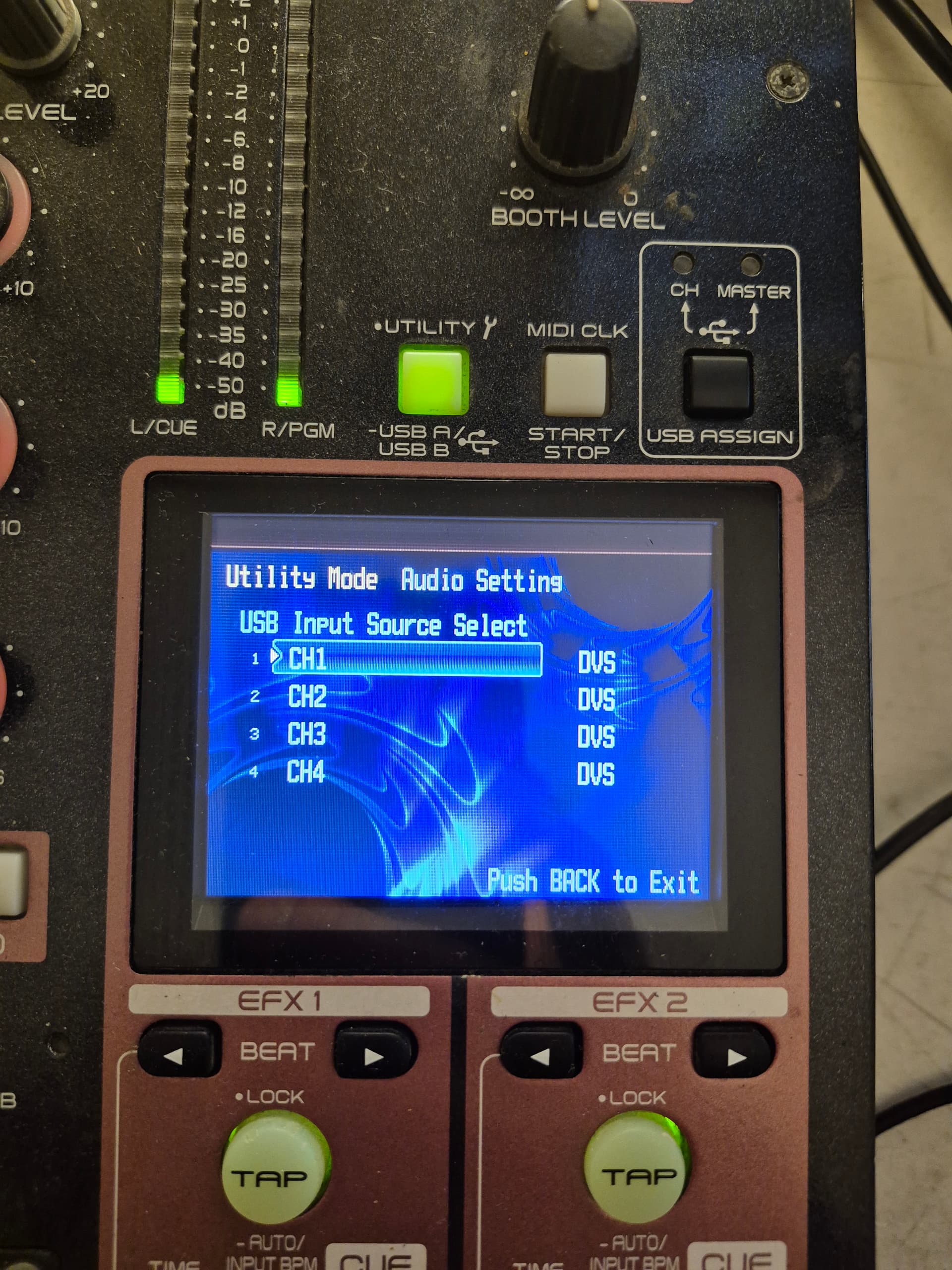 1-Select “7 USB Audio Setting” – “3 Input Source Select” – “CH1~4” in the “Utility Settings”, and check that the settings are “DVS”.