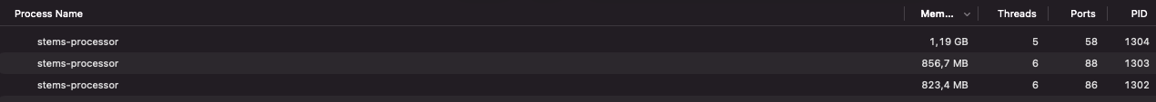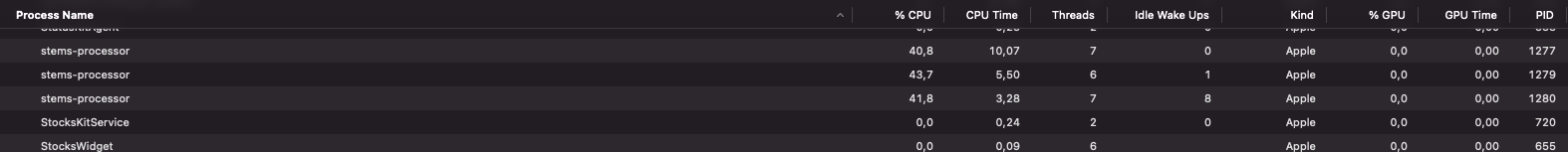 Now for Stems Ok, 3 processes for stems and the Engine process (not in the screenshot). Maybe number of p-cores +1? Who knows… percentage used could indicate that those are scheduled only on p-cores. Or maybe the nural part of the SOC is used, I honestly don’t know what could indicate that.