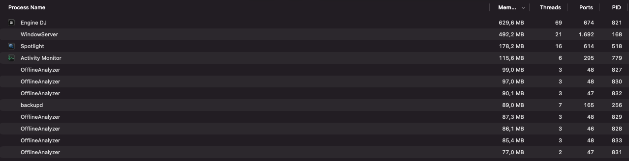 Track analysis creates 7 OfflineAnalyzer processes. This can either be a static number or be calculated the cpu cores or threads available +1. The A18 pro has 2 performance and 4 efficiency cores so it would add up. But it’s hard to tell on proprietary software… So around 90mb of memory for an analyze process.