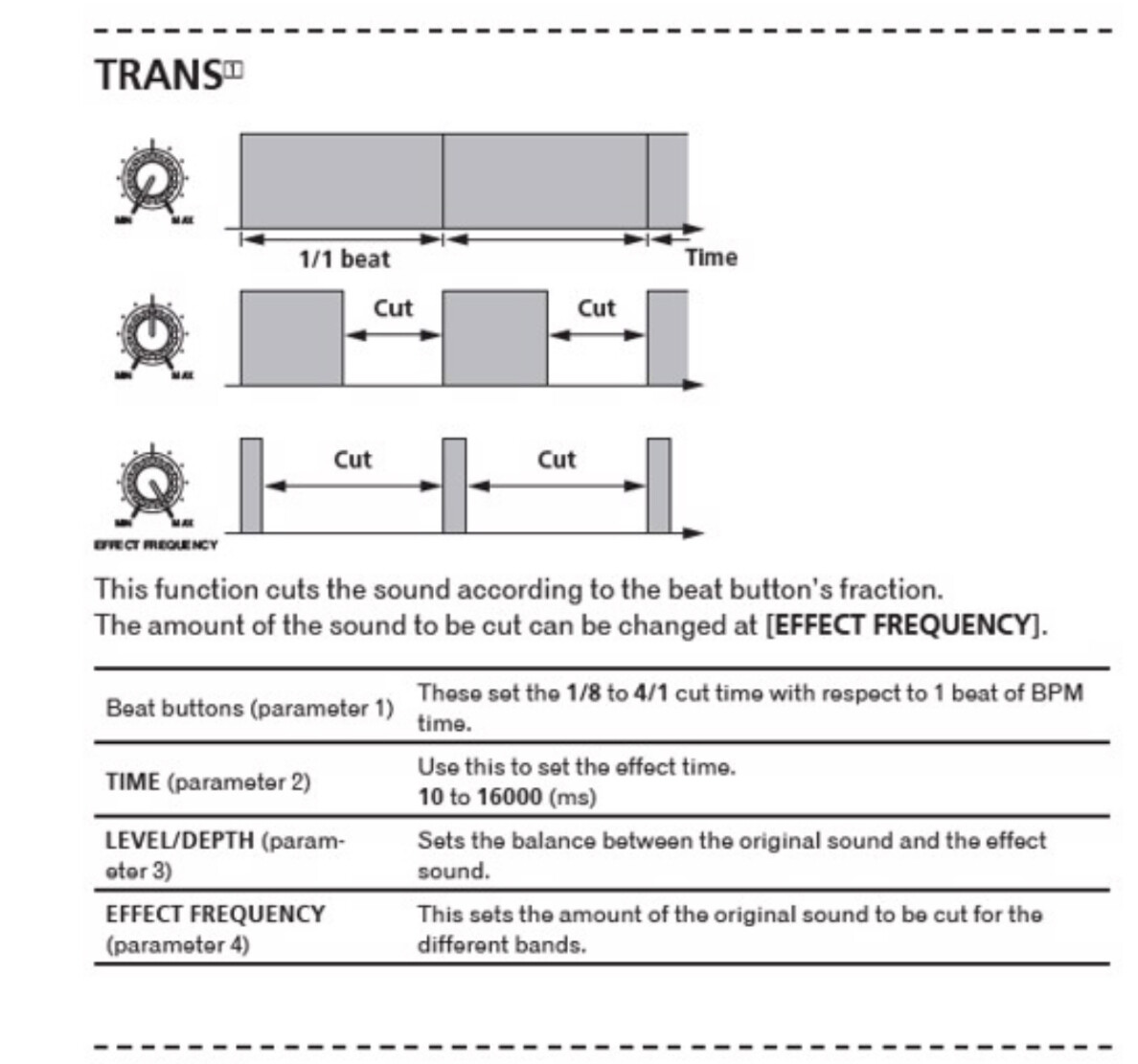 Trans is short for ātransformā, a scratch technique used to cut up longer sounds and create silences in that sound. The trans effect automates that process and is a creative effect to mix with.