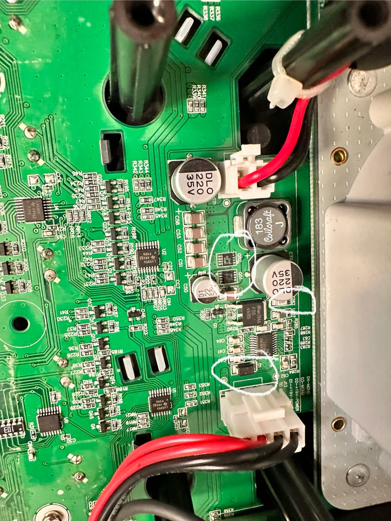 After repairing this buck converter I sugest to mount a heatsink on the top of this two fets to prevent future fail. You cand glue the heatsink with termoconductive glue on top of the fets.