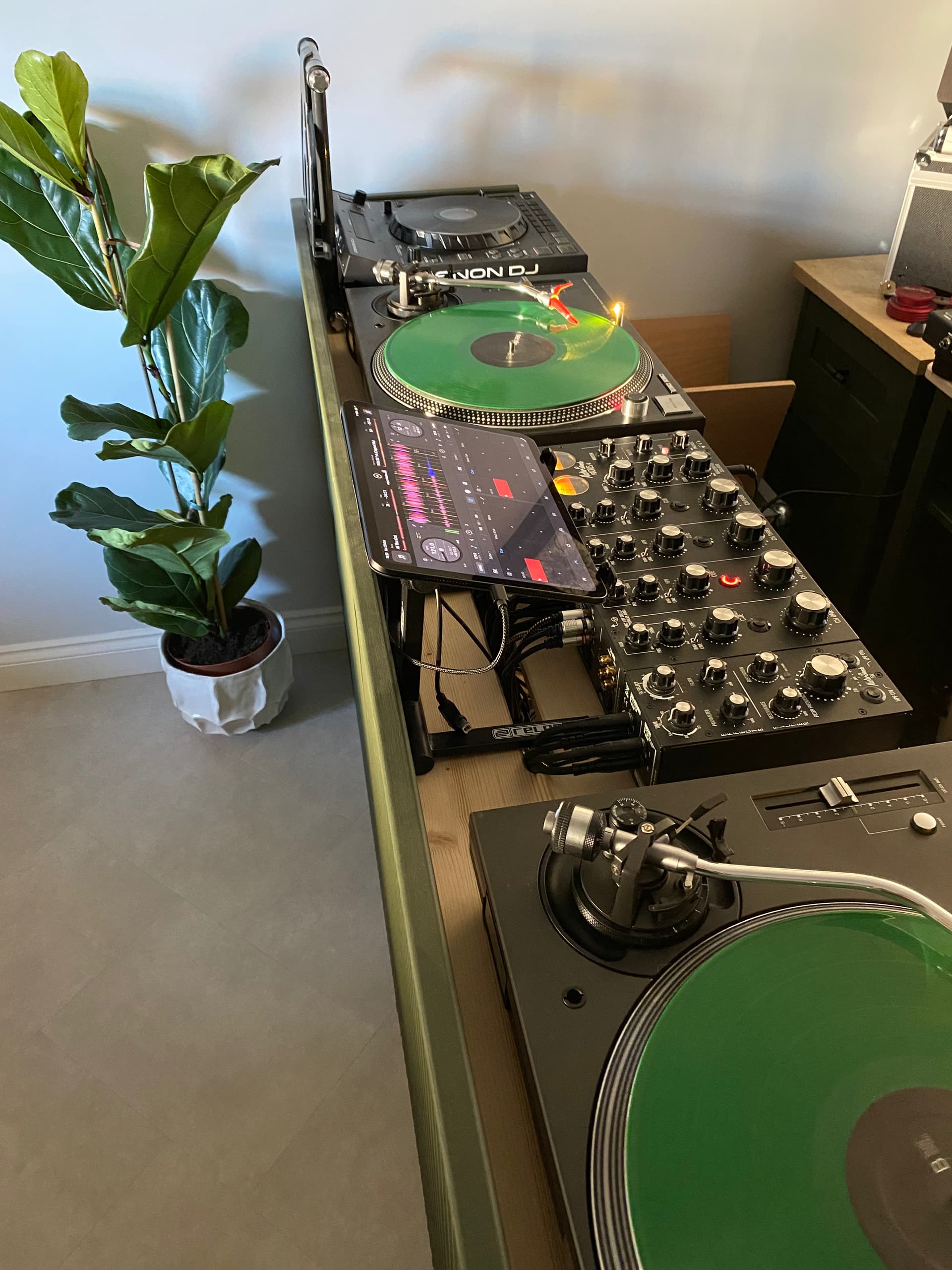 Thatās nice and neat cable hiding with the green board thing. I need to do something like this as I have about 50 cables dangling connecting everything from the decks to speakers to music production hardware and hubs. When I am in front of the decks and monitor I canāt see the cables but if I am sitting on my sofa on the other side of the room it fills me with anxiety lol. Was thinking just to drape a cloth to hide it but paranoid of electric stuff shorting and burning down the house lol. But thanks for sharing, looks like in need to build something like what you have.