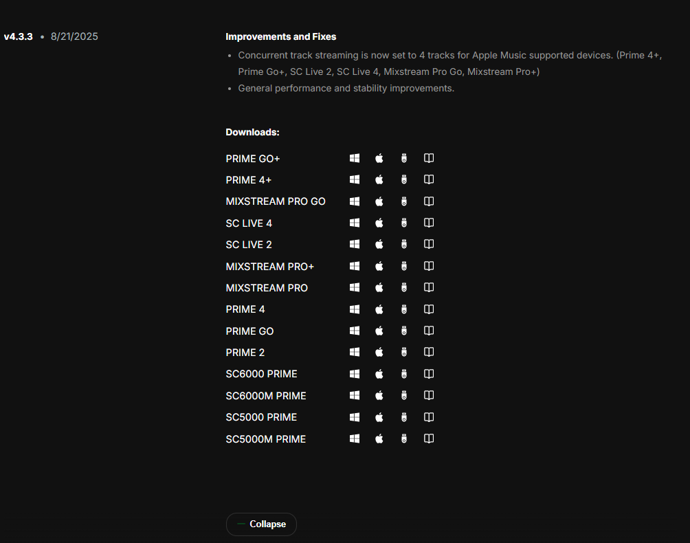 Concurrent track streaming is now set to 4 tracks for Apple Music supported devices. (Prime 4+, Prime Go+, SC Live 2, SC Live 4, Mixstream Pro Go, Mixstream Pro+)