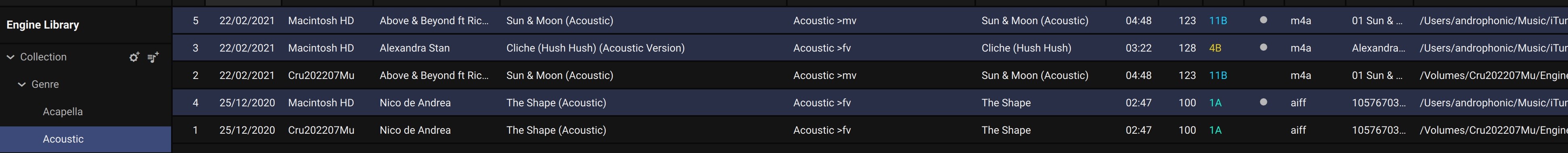 If you look closely, there is another Engine DJ anomaly! The desktop Acoustic playlist has three tracks showing in Engine Desktop (and Lexicon DJ). The USB/OS drive only shows two of the three (Cliche is missing) in Engine Desktop. Lexicon DJ did the sync correctly, because, all three of those tracks show when the USB/OS drive is plugged into the SC6000. Lucky for me, Engine OS is reading the playlists correctly on the players.